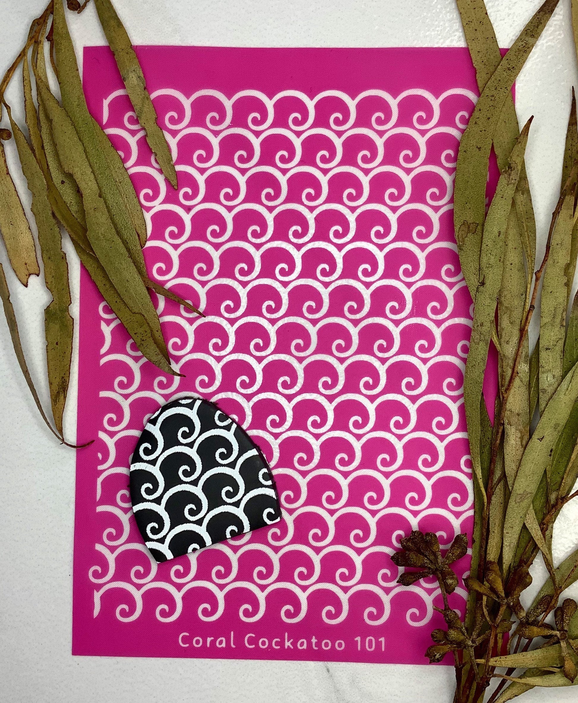 How to use your new Coral Cockatoo Silkscreen: Place the silk screen on top of your polymer clay or other decorative surface, make sure you can read the Coral Cockatoo Logo, it is facing the right way up. Apply your colour in the form of a good quality Artists Acrylic paint, gently swipe the paint across the silkscreen with a squeegee, scraper or old card, hold the squeegee at a 45 degree angle and pull towards you gently, pulling the paint across the silk screen. Once adequately spread through the design, lift up the silk screen by gently starting with the bottom right hand corner.