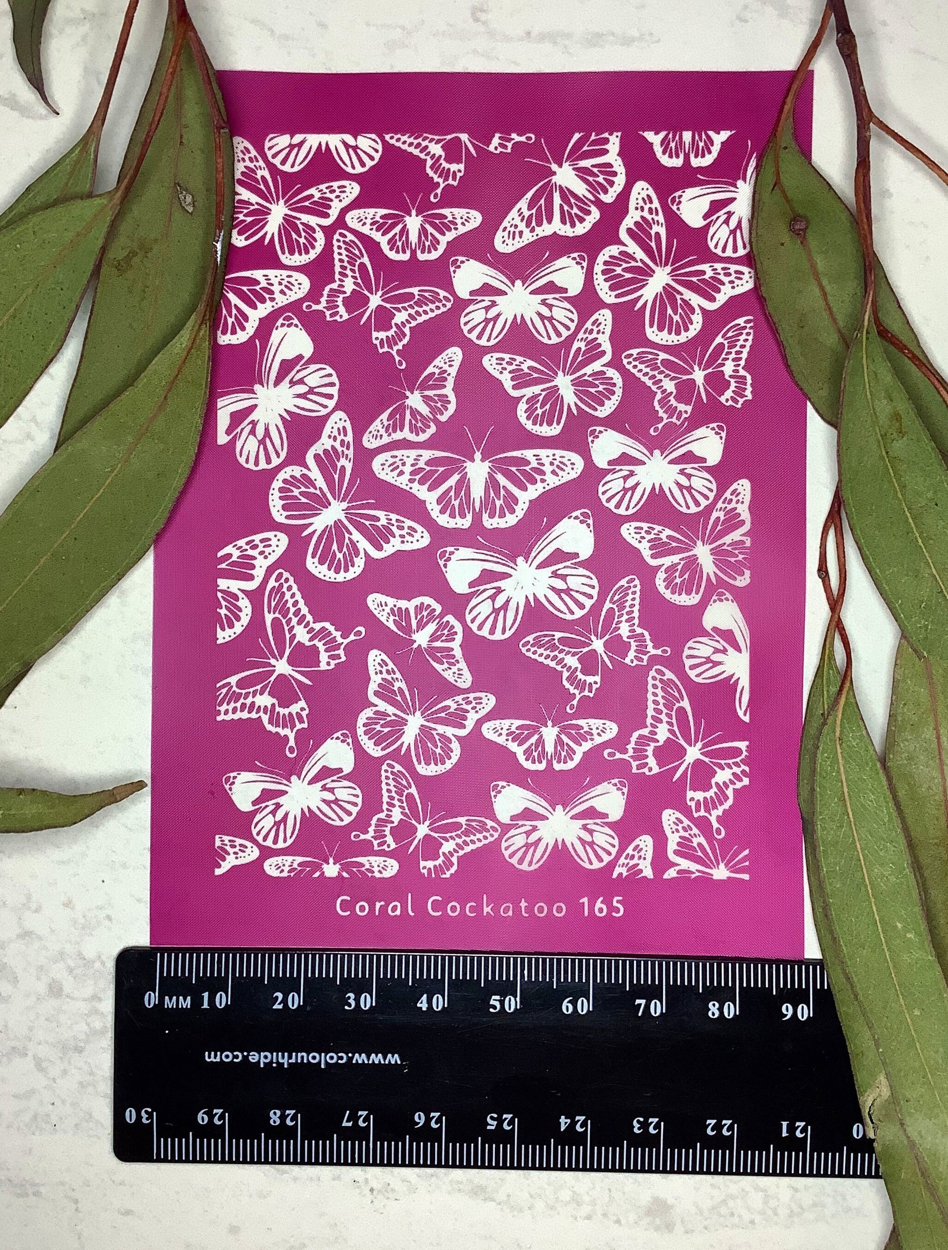 How to use your new Coral Cockatoo Silkscreen: Place the silk screen on top of your polymer clay or other decorative surface, make sure you can read the Coral Cockatoo Logo, it is facing the right way up. Apply your colour in the form of a good quality Artists Acrylic paint, gently swipe the paint across the silkscreen with a squeegee, scraper or old card, hold the squeegee at a 45 degree angle and pull towards you gently, pulling the paint across the silk screen. Once adequately spread through the design, lift up the silk screen by gently starting with the bottom right hand corner.