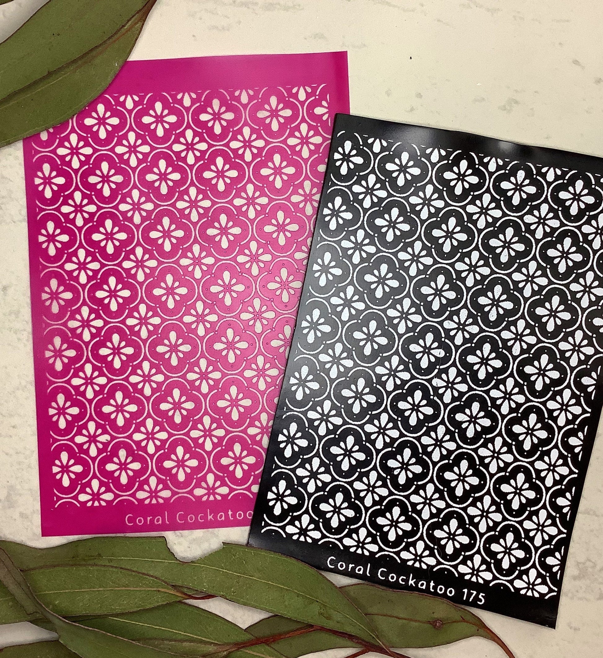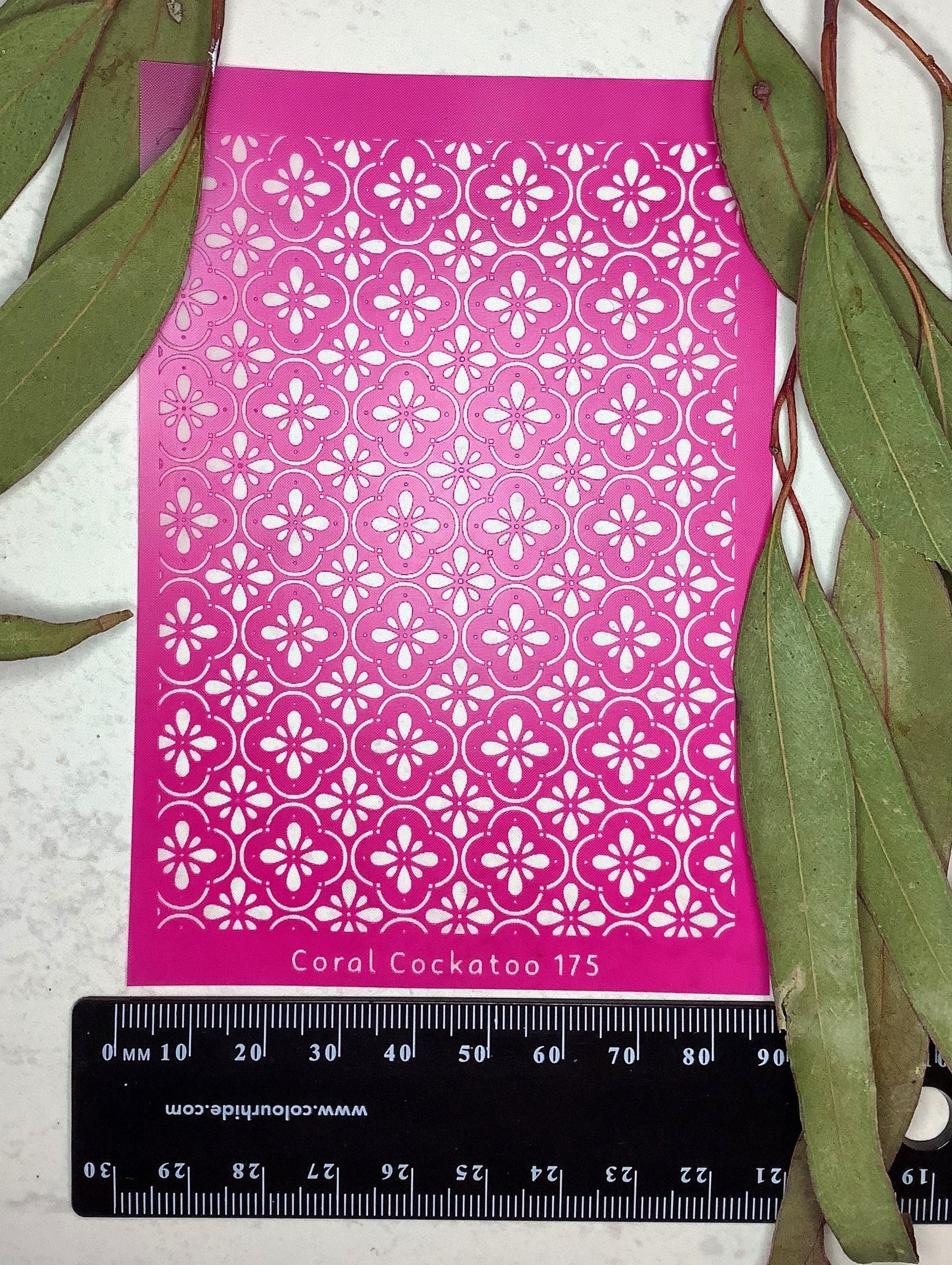 How to use your new Coral Cockatoo Silkscreen: Place the silk screen on top of your polymer clay or other decorative surface, make sure you can read the Coral Cockatoo Logo, it is facing the right way up. Apply your colour in the form of a good quality Artists Acrylic paint, gently swipe the paint across the silkscreen with a squeegee, scraper or old card, hold the squeegee at a 45 degree angle and pull towards you gently, pulling the paint across the silk screen. Once adequately spread through the design, lift up the silk screen by gently starting with the bottom right hand corner.