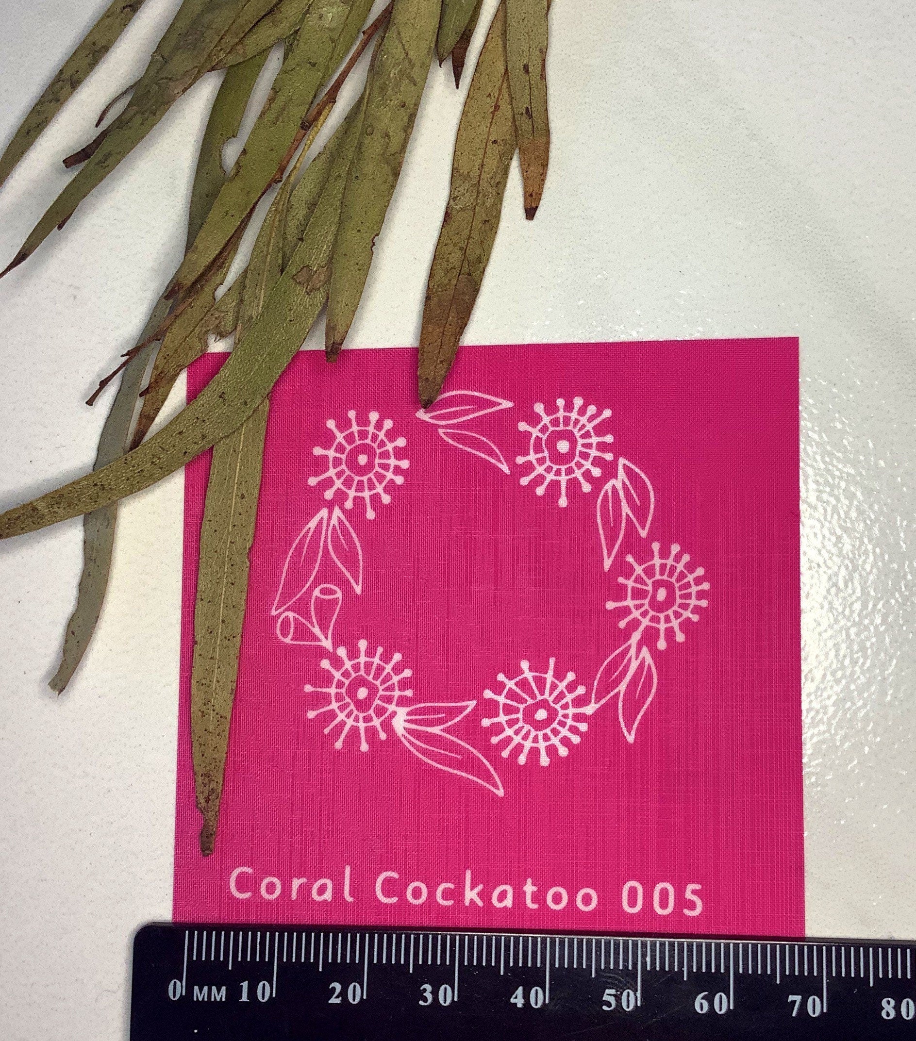 Silkscreen originally designed and handmade in Tasmania, Australia. 🌸EUCALYPTUS BUSH WREATH 005🌸 🌸Size🌸 Silkscreen size 5CM X 4.5CM Made on a 43 T (thread count-wider mesh) for use with glazes. For use with ceramics, pottery, polymer clay and many other materials for all your creative desires! 🌸Use🌸 Use our unique and originally designed silkscreens for anything from Homewares to Earring and Jewellery pieces to paper craft, card creations, soap and cake decorating! Make sure you tag us in your creations on Instagram @coralcockatoo so we can see your amazing creations. Place the stencil on top of your polymer clay, apply some pressure with a roller so you start to get an embossing effect, it doesn’t matter which side you use 😊. Apply your colour in the form of acrylic paint (or experiment with micas!) gently cover the design in paint across the stencil with an old card or sponge, lift up the stencil by gently starting with the bottom right hand corner and and move in a diagonal direction slowly allowing the clay the separate from the stencil. Wash the stencil gently in cool water with a small amount of gentle hand soap or gently use a wet wipe. It is important to note that some paints with heavy pigment may stain your stencil, this will not affect its use. Once rinsed through allow to dry and then it is ready to be used again! 🌸Processing Time, Shipping & Handling 🌸 Please allow 5-7 Business Days for your order to be completed. All products are hand made to order in our studio just for you. Due to the current pandemic there is a delay in shipping and is out of our control, we endeavour to get your order out as soon as possible, however it can sometimes take longer than expected at the moment. Domestic Shipping We offer $10 flat rate shipping and handling across Australia with Australia Post. If you require express shipping please select the $13 option, please note this is carrier delivery and not the speed in which your silk screen is made. If you require your order created in a shorter time frame please contact us before placing the order. International Shipping Yes we offer international shipping!! Please select from the available countries, if yours is not shown in the shipping options please contact us to see how we can help you! Please keep in mind that with the current pandemic it can sometimes take in excess of 8 weeks to arrive, this is out of our control, we will provide a tracking number to allow you to track your order, once it leaves Coral Cockatoo it is out of our control. 🌸Legal🌸 By purchasing this silk screen you are acknowledging that you will not digitally reproduce Coral Cockatoo designs or sell Coral Cockatoo designs in their entirety. 💗🌸Thank You🌸💗 Thank you so much for purchasing our product! It is really very much appreciated that you are buying a product that is designed and handmade in Tasmania Australia by our small business. A great big Thank You from B & Fi xx Coral Cockatoo