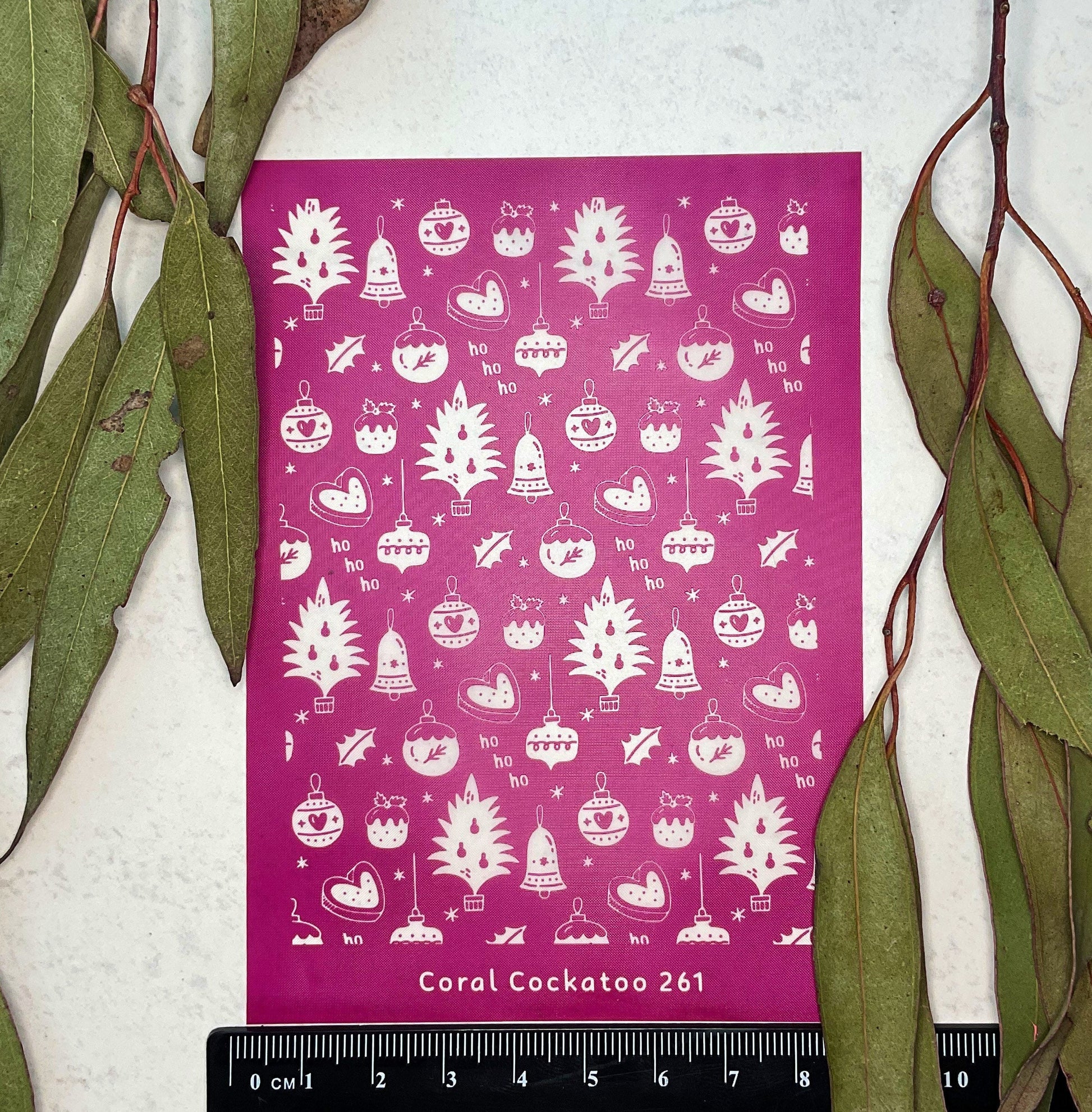 How to use your new Coral Cockatoo Silkscreen: Place the silk screen on top of your polymer clay or other decorative surface, make sure you can read the Coral Cockatoo Logo, it is facing the right way up. Apply your colour in the form of a good quality Artists Acrylic paint, gently swipe the paint across the silkscreen with a squeegee, scraper or old card, hold the squeegee at a 45 degree angle and pull towards you gently, pulling the paint across the silk screen. Once adequately spread through the design, lift up the silk screen by gently starting with the bottom right hand corner.