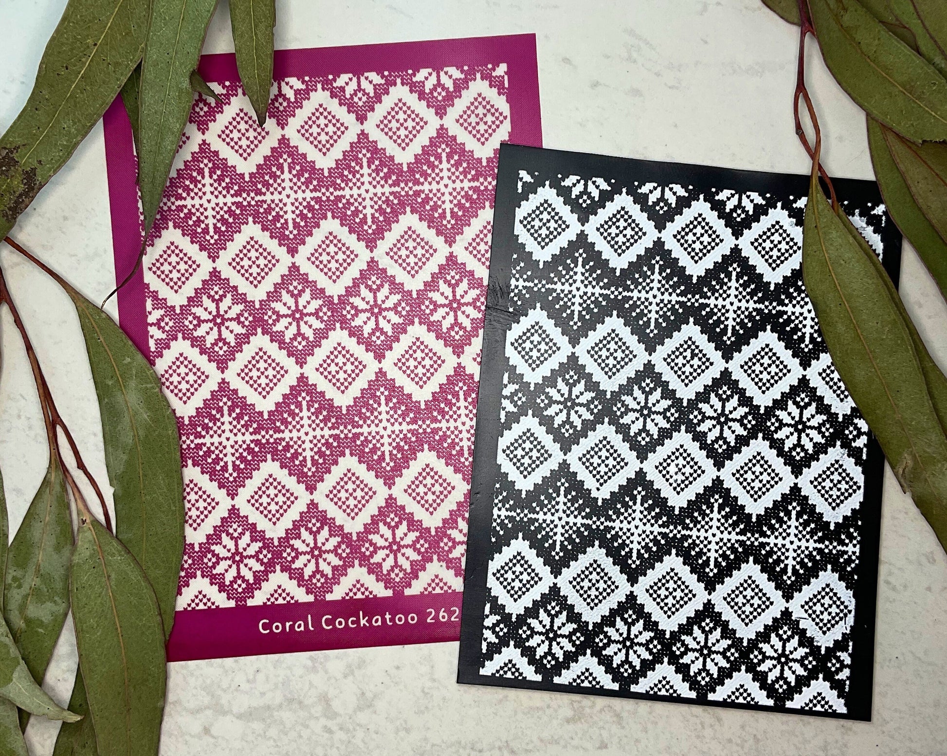 How to use your new Coral Cockatoo Silkscreen: Place the silk screen on top of your polymer clay or other decorative surface, make sure you can read the Coral Cockatoo Logo, it is facing the right way up. Apply your colour in the form of a good quality Artists Acrylic paint, gently swipe the paint across the silkscreen with a squeegee, scraper or old card, hold the squeegee at a 45 degree angle and pull towards you gently, pulling the paint across the silk screen. Once adequately spread through the design, lift up the silk screen by gently starting with the bottom right hand corner.