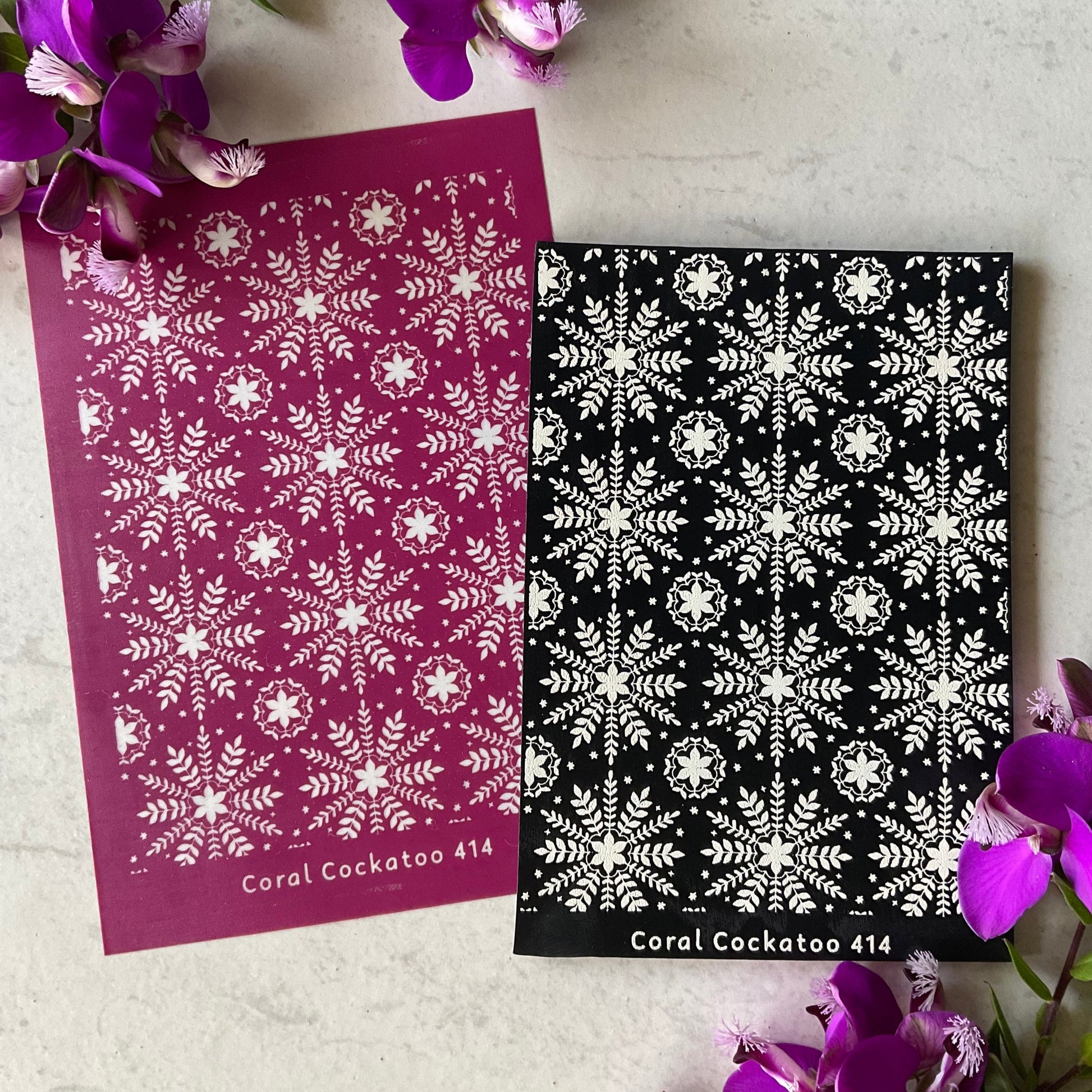 How to use your new Coral Cockatoo Silkscreen: Place the silk screen on top of your polymer clay or other decorative surface, make sure you can read the Coral Cockatoo Logo, it is facing the right way up. Apply your colour in the form of a good quality Artists Acrylic paint, gently swipe the paint across the silkscreen with a squeegee, scraper or old card, hold the squeegee at a 45 degree angle and pull towards you gently, pulling the paint across the silk screen. Once adequately spread through the design, lift up the silk screen by gently starting with the bottom right hand corner.