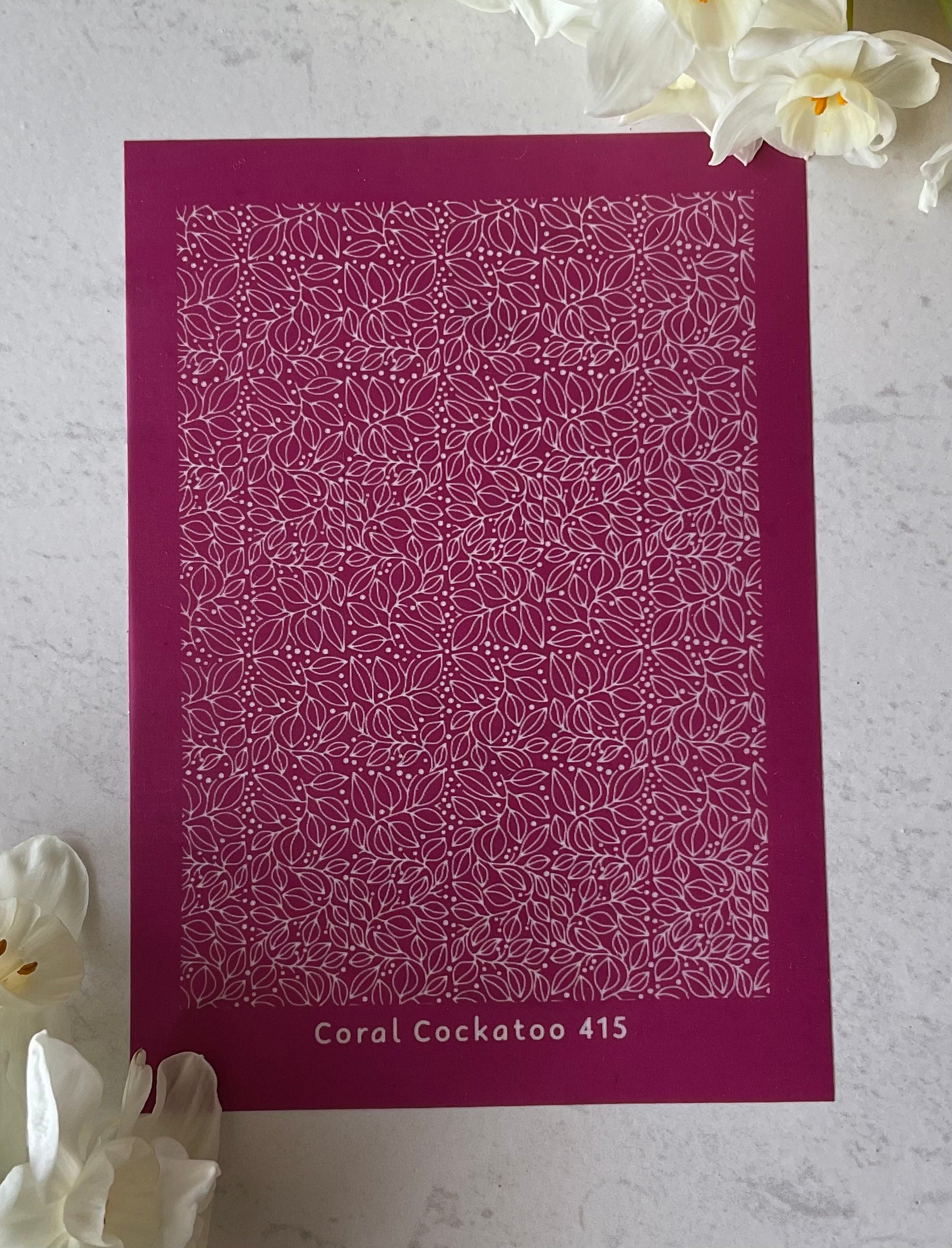 How to use your new Coral Cockatoo Silkscreen: Place the silk screen on top of your polymer clay or other decorative surface, make sure you can read the Coral Cockatoo Logo, it is facing the right way up. Apply your colour in the form of a good quality Artists Acrylic paint, gently swipe the paint across the silkscreen with a squeegee, scraper or old card, hold the squeegee at a 45 degree angle and pull towards you gently, pulling the paint across the silk screen. Once adequately spread through the design, lift up the silk screen by gently starting with the bottom right hand corner.