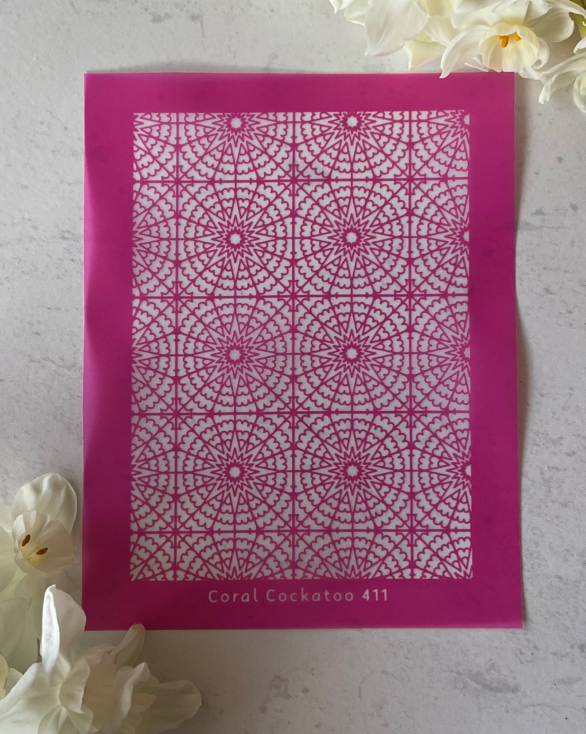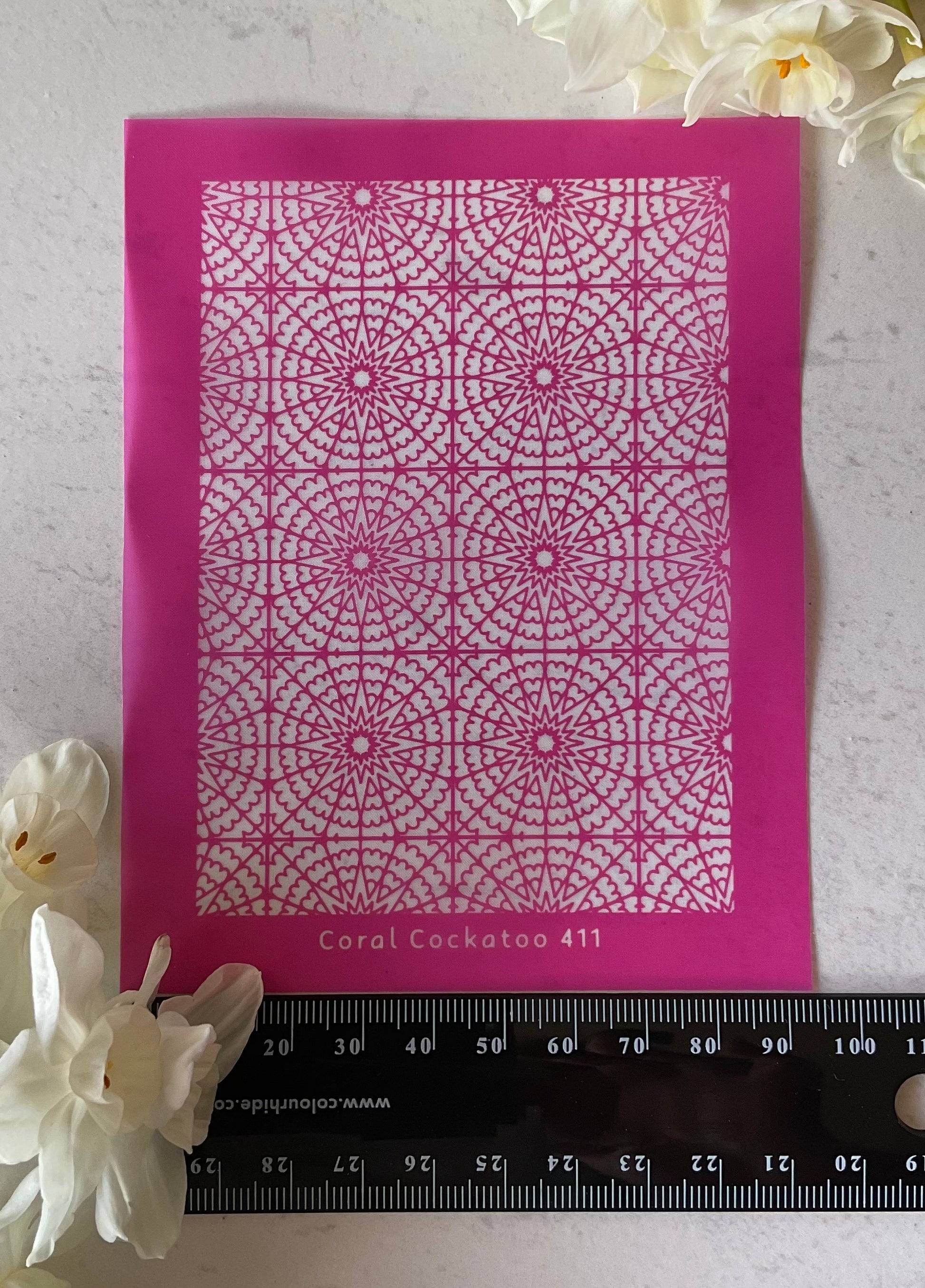 How to use your new Coral Cockatoo Silkscreen: Place the silk screen on top of your polymer clay or other decorative surface, make sure you can read the Coral Cockatoo Logo, it is facing the right way up. Apply your colour in the form of a good quality Artists Acrylic paint, gently swipe the paint across the silkscreen with a squeegee, scraper or old card, hold the squeegee at a 45 degree angle and pull towards you gently, pulling the paint across the silk screen. Once adequately spread through the design, lift up the silk screen by gently starting with the bottom right hand corner.