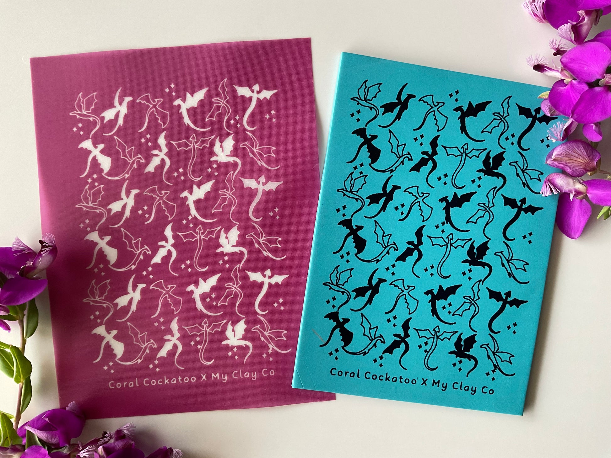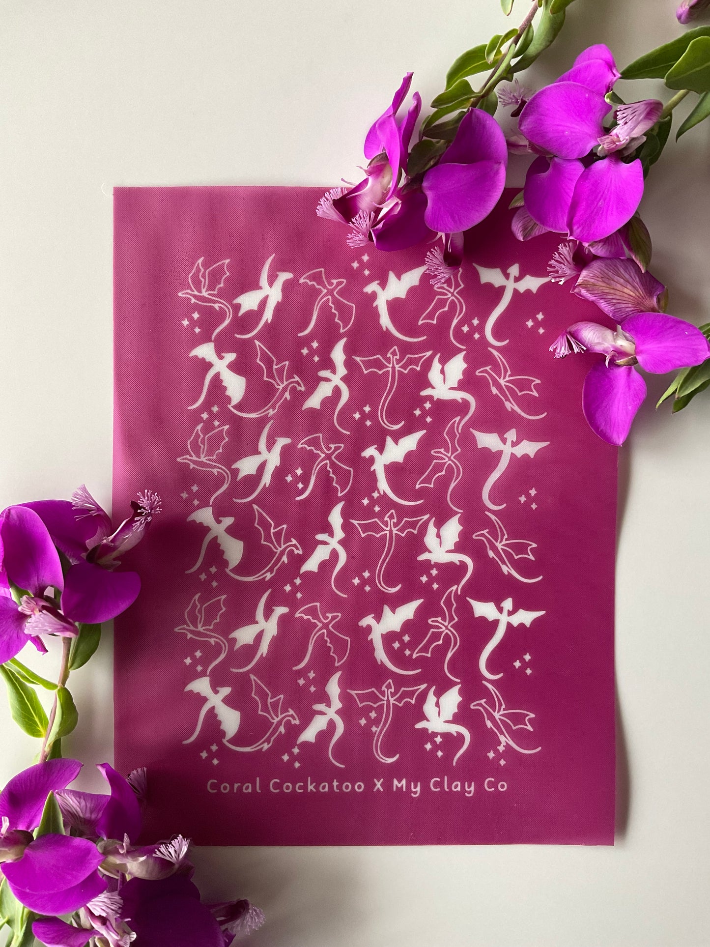 Take your creations to the next level with the Dragon Flight silk screen! This silk screen was designed by My Clay Co and made by Coral Cockatoo.