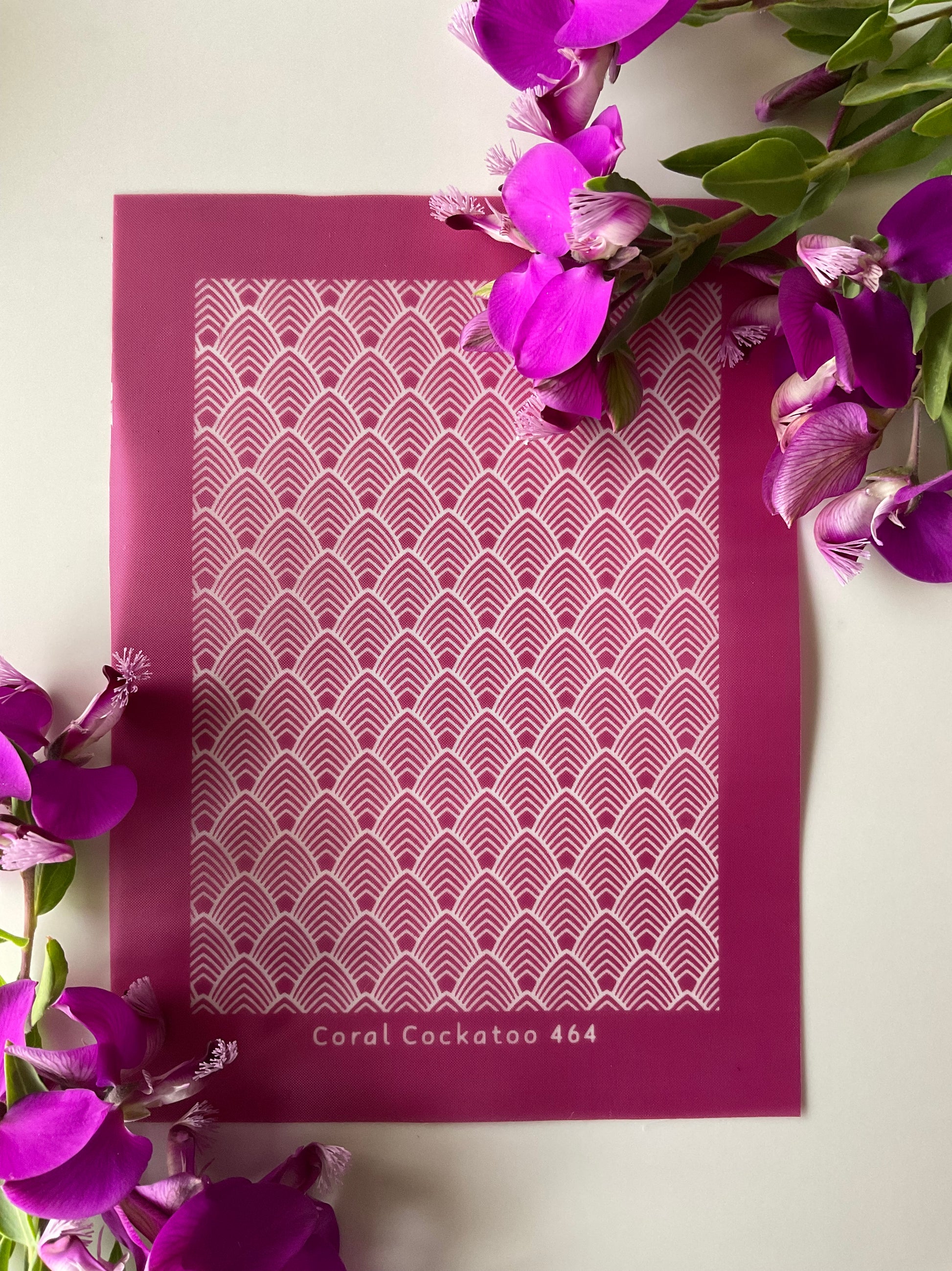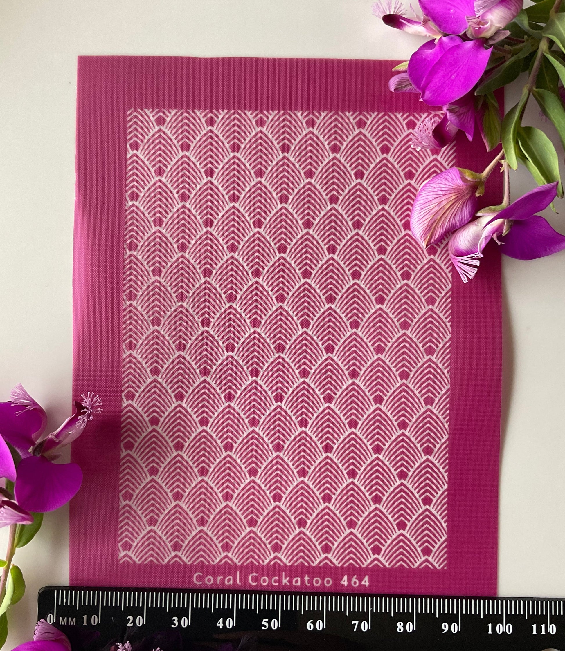 How to use your new Coral Cockatoo Silkscreen: Place the silk screen on top of your polymer clay or other decorative surface, make sure you can read the Coral Cockatoo Logo, it is facing the right way up. Apply your colour in the form of a good quality Artists Acrylic paint, gently swipe the paint across the silkscreen with a squeegee, scraper or old card, hold the squeegee at a 45 degree angle and pull towards you gently, pulling the paint across the silk screen. Once adequately spread through the design, lift up the silk screen by gently starting with the bottom right hand corner.