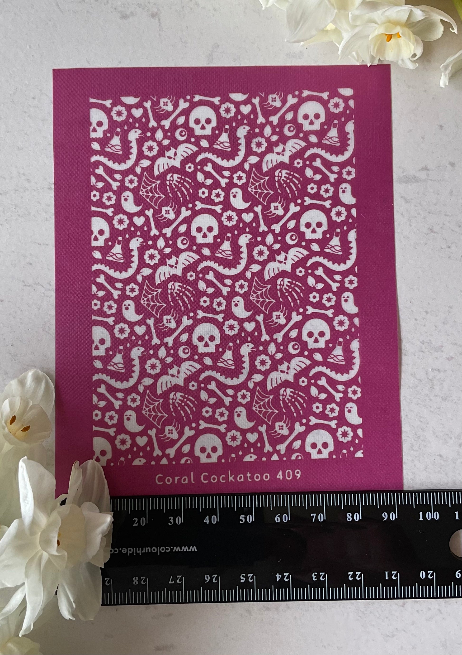 How to use your new Coral Cockatoo Silkscreen: Place the silk screen on top of your polymer clay or other decorative surface, make sure you can read the Coral Cockatoo Logo, it is facing the right way up. Apply your colour in the form of a good quality Artists Acrylic paint, gently swipe the paint across the silkscreen with a squeegee, scraper or old card, hold the squeegee at a 45 degree angle and pull towards you gently, pulling the paint across the silk screen. Once adequately spread through the design, lift up the silk screen by gently starting with the bottom right hand corner.
