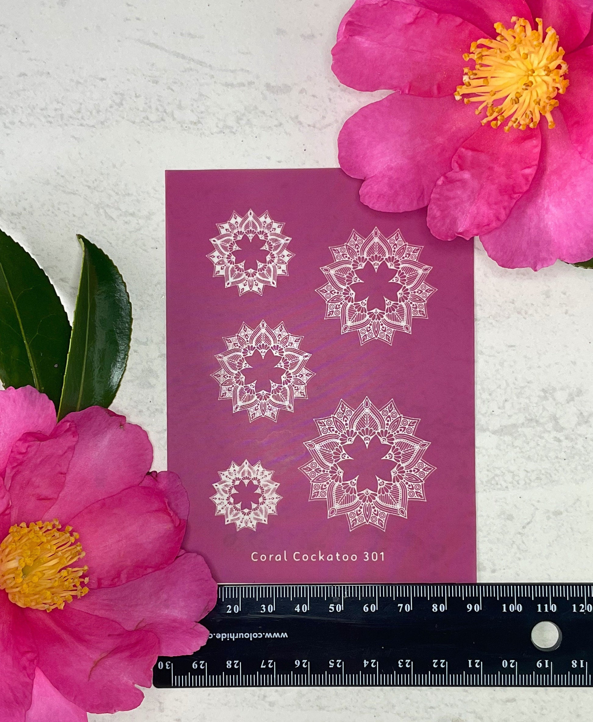 How to use your new Coral Cockatoo Silkscreen: Place the silk screen on top of your polymer clay or other decorative surface, make sure you can read the Coral Cockatoo Logo, it is facing the right way up. Apply your colour in the form of a good quality Artists Acrylic paint, gently swipe the paint across the silkscreen with a squeegee, scraper or old card, hold the squeegee at a 45 degree angle and pull towards you gently, pulling the paint across the silk screen. Once adequately spread through the design, lift up the silk screen by gently starting with the bottom right hand corner.