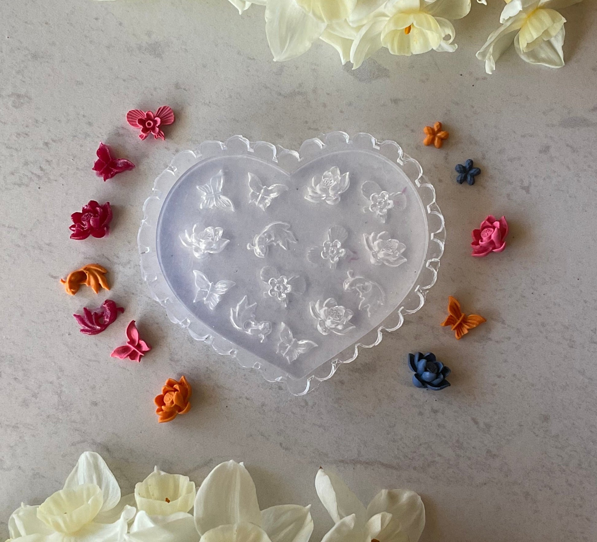 Create beautiful flowery treats with our Butterflies, Koi & Waterlilies Floral Miniature Silicone Mold! You can use it with polymer clay, UV resin, liquid clay, or even bake them in the oven to make some truly petal-perfect shapes! Your projects will bloom with delight!
