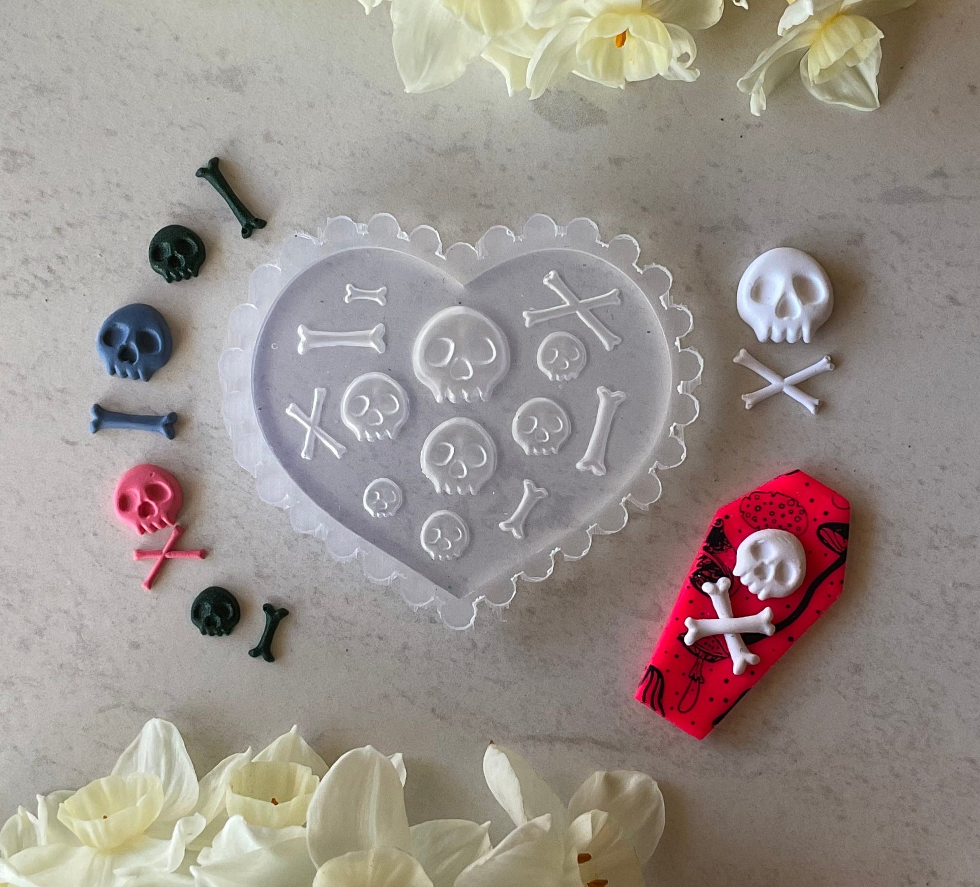 Creep out your clay creations with our Spooky Halloween Skulls & Crossbones Miniature Silicone Mold! This miniature mold's perfect for polymer clay, UV resin, or liquid clay, and you can even bake them in the oven for a spook-tacular finish. Don't forget to bat an eye at this boo-tiful mold!!