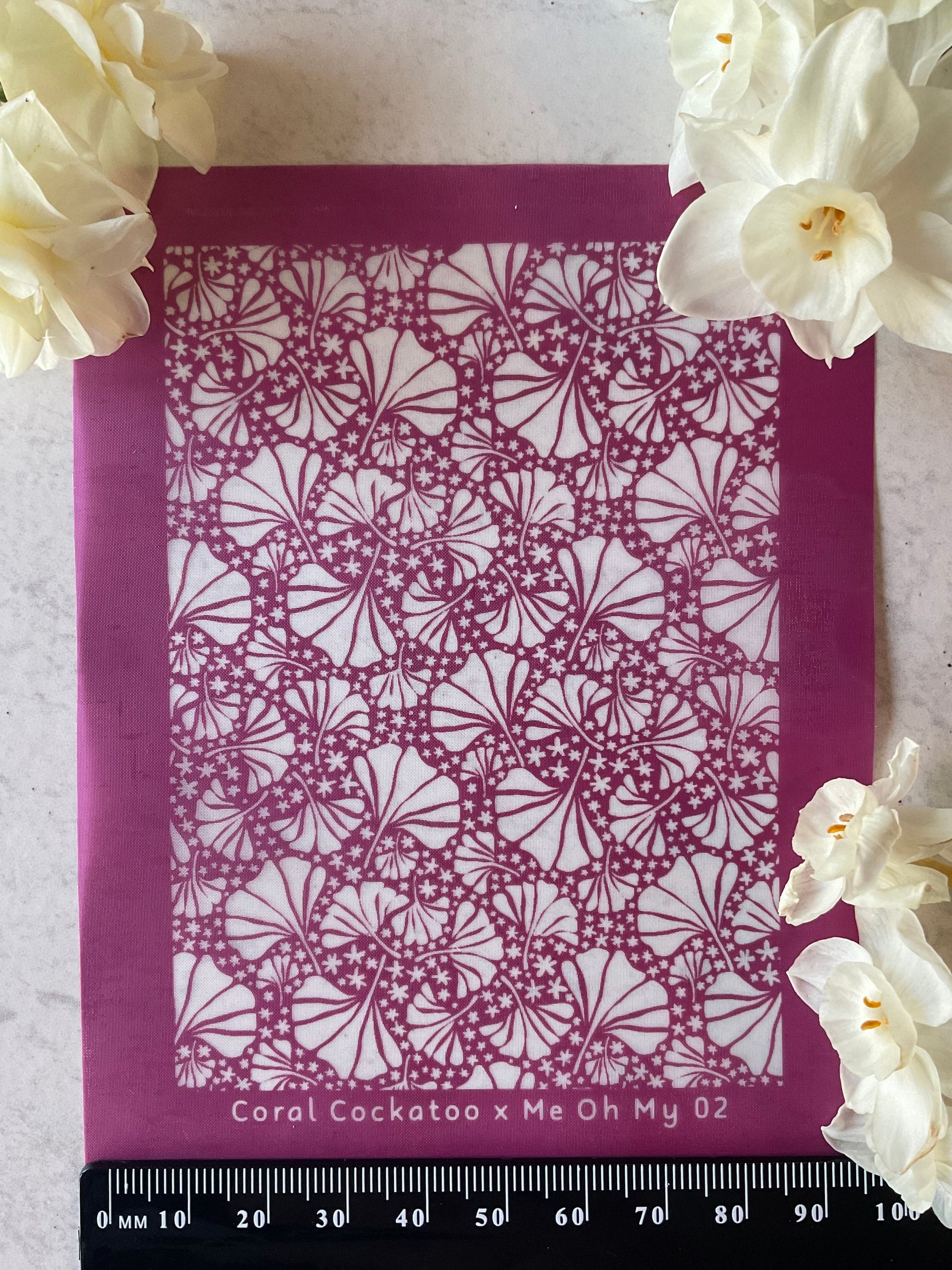 How to use your newย Coral Cockatoo Silkscreen:ย Place the silk screen on top of your polymer clay or other decorative surface, make sure you can read the Coral Cockatoo Logo, it is facing the right way up. Apply your colour in the form of a good quality Artists Acrylic paint, gently swipe the paint across the silkscreen with a squeegee, scraper or old card, hold the squeegee at a 45 degree angle and pull towards you gently, pulling the paint across the silk screen. Once adequately spread through the design, lift up the silk screen by gently starting with the bottom right hand corner.ย