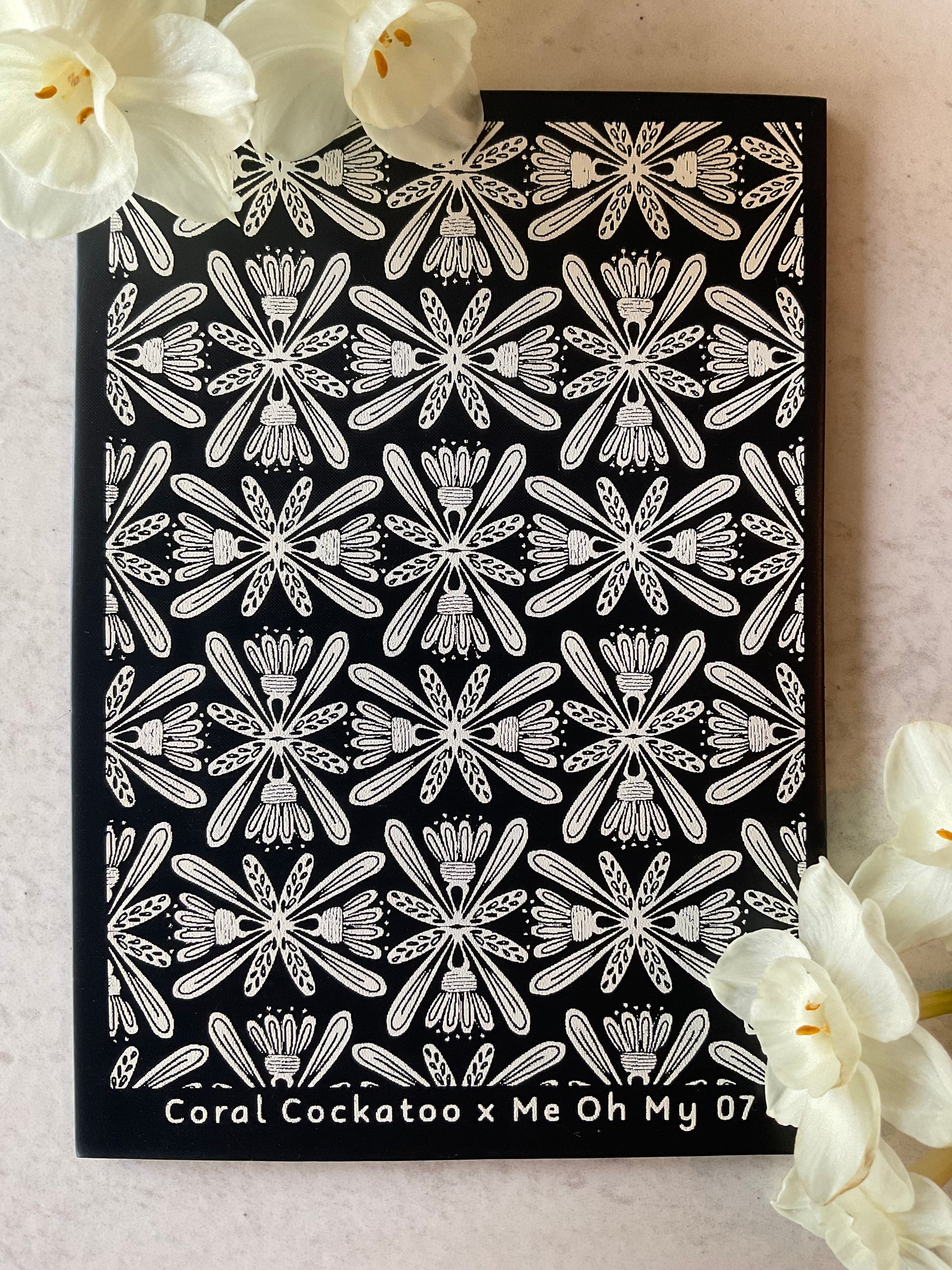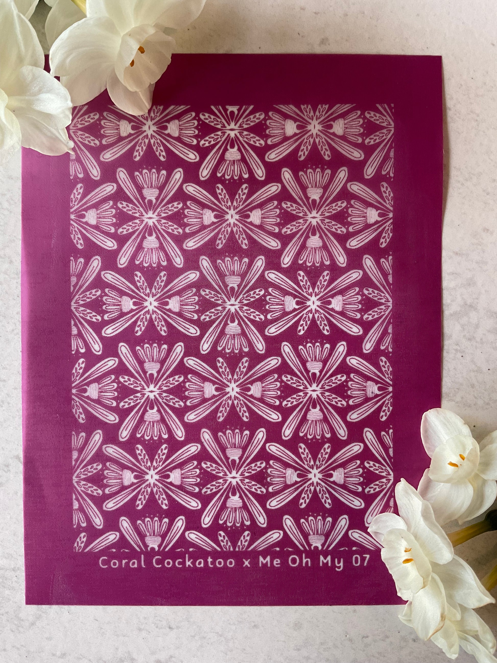How to use your newย Coral Cockatoo Silkscreen:ย Place the silk screen on top of your polymer clay or other decorative surface, make sure you can read the Coral Cockatoo Logo, it is facing the right way up. Apply your colour in the form of a good quality Artists Acrylic paint, gently swipe the paint across the silkscreen with a squeegee, scraper or old card, hold the squeegee at a 45 degree angle and pull towards you gently, pulling the paint across the silk screen. Once adequately spread through the design, lift up the silk screen by gently starting with the bottom right hand corner.ย