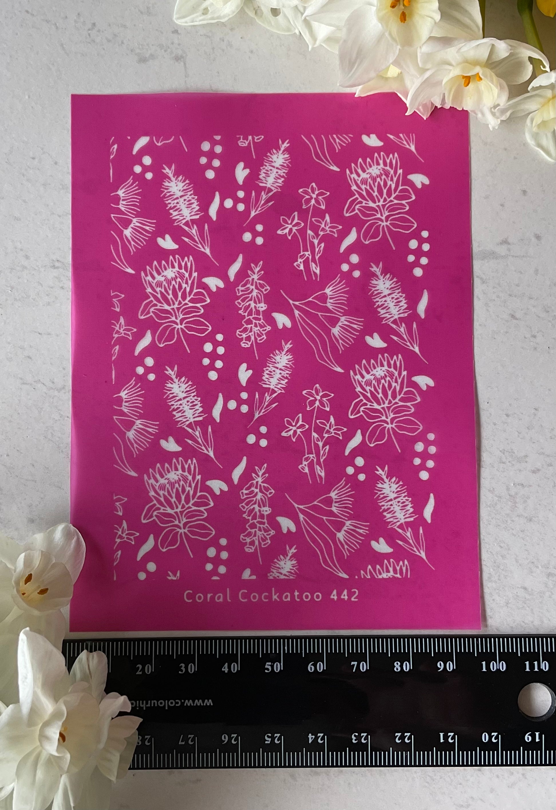 Important Info: Use your unique Coral Cockatoo Silkscreen for anything from earring and jewellery pieces to paper craft and card creations and more! The possibilities are limited only by your imagination and creativity!