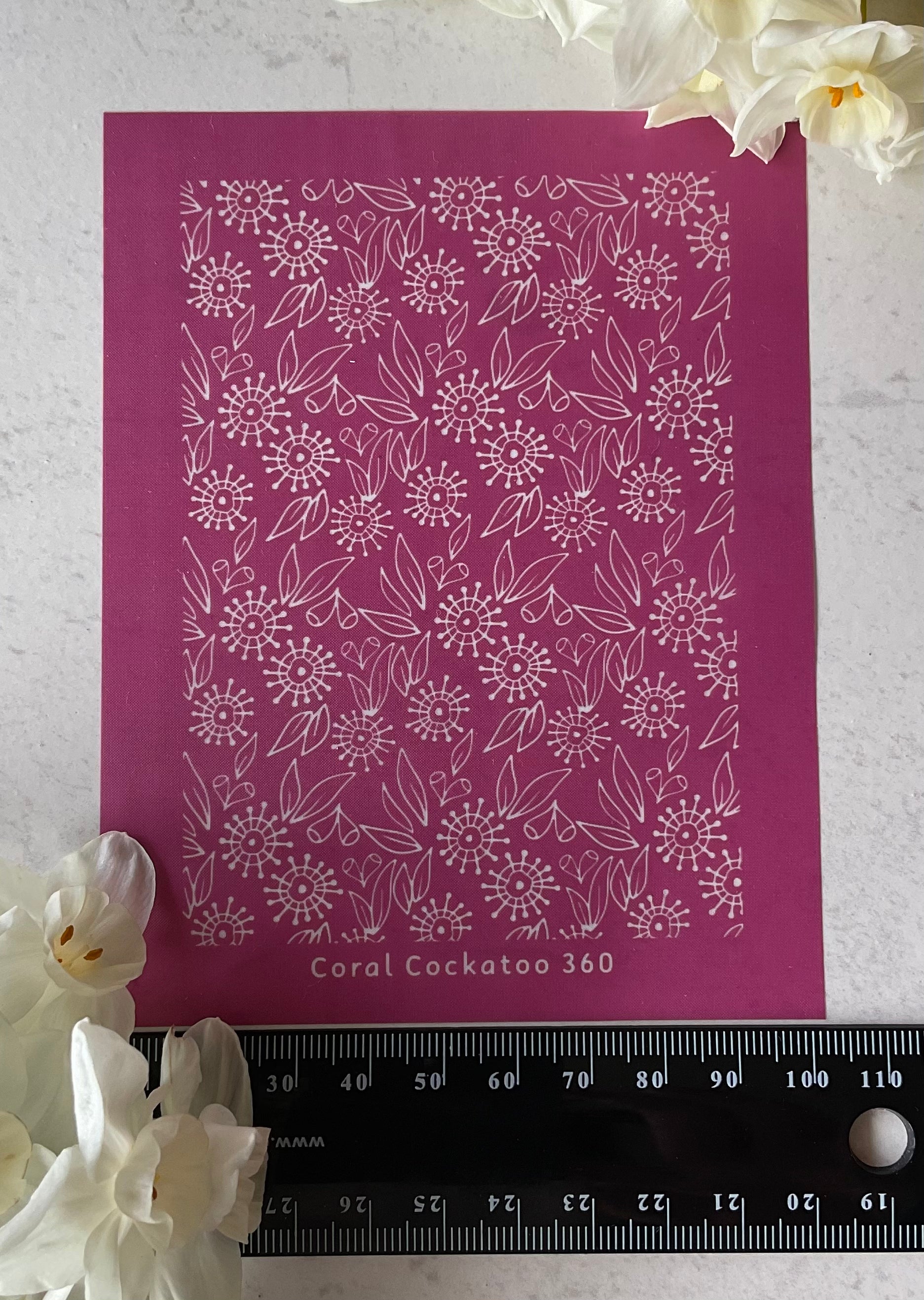 How to use your new Coral Cockatoo Silkscreen: Place the silk screen on top of your polymer clay or other decorative surface, make sure you can read the Coral Cockatoo Logo, it is facing the right way up. Apply your colour in the form of a good quality Artists Acrylic paint, gently swipe the paint across the silkscreen with a squeegee, scraper or old card, hold the squeegee at a 45 degree angle and pull towards you gently, pulling the paint across the silk screen. Once adequately spread through the design, lift up the silk screen by gently starting with the bottom right hand corner.