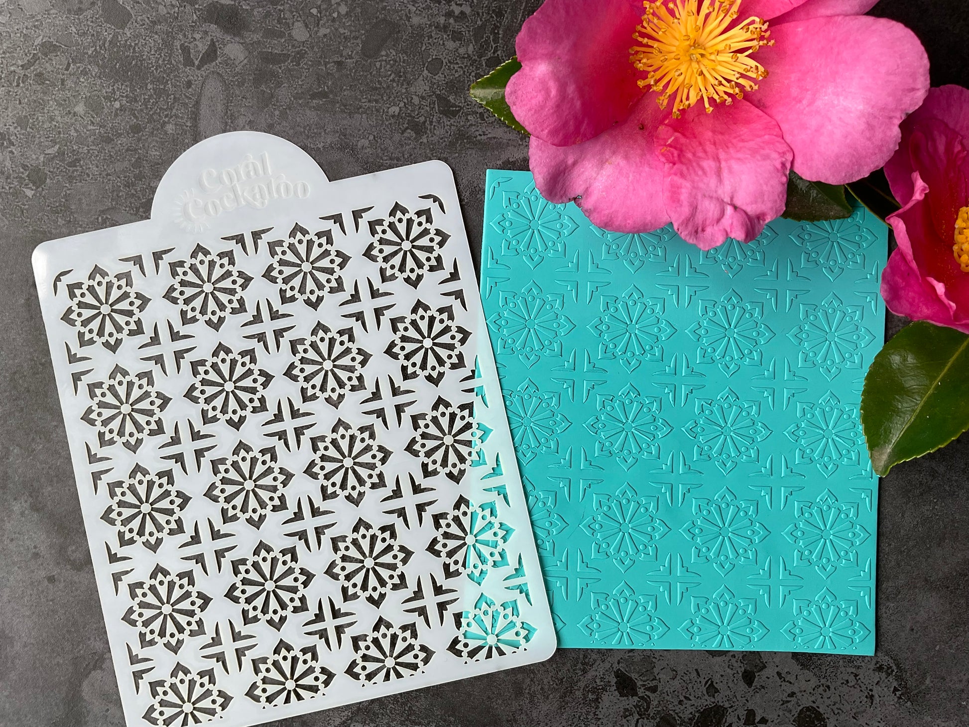 Place the stencil on top of your polymer clay, apply some pressure with a roller so you start to get an embossing effect, it doesn’t matter which side you use 😊. Apply your colour in the form of acrylic paint (or experiment with micas!) gently cover the design in paint across the stencil with an old card or sponge, lift up the stencil by gently starting with the bottom right hand corner and and move in a diagonal direction slowly allowing the clay the separate from the stencil. Wash the stencil gently in cool water with a small amount of gentle hand soap or gently use a wet wipe. It is important to note that some paints and micas with heavy pigment may stain your stencil, this will not affect its use. Once rinsed, allow to dry and then it is ready to be used again!