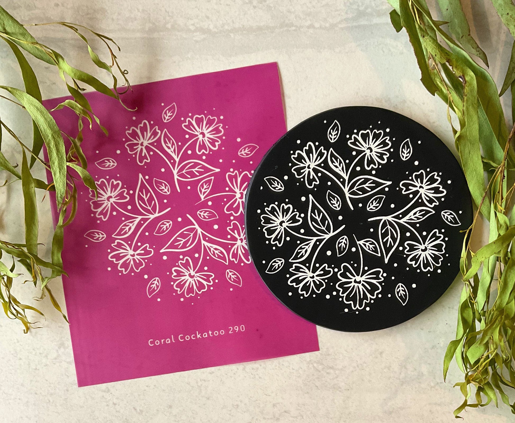 How to use your new Coral Cockatoo Silkscreen: Place the silk screen on top of your polymer clay or other decorative surface, make sure you can read the Coral Cockatoo Logo, it is facing the right way up. Apply your colour in the form of a good quality Artists Acrylic paint, gently swipe the paint across the silkscreen with a squeegee, scraper or old card, hold the squeegee at a 45 degree angle and pull towards you gently, pulling the paint across the silk screen. Once adequately spread through the design, lift up the silk screen by gently starting with the bottom right hand corner.