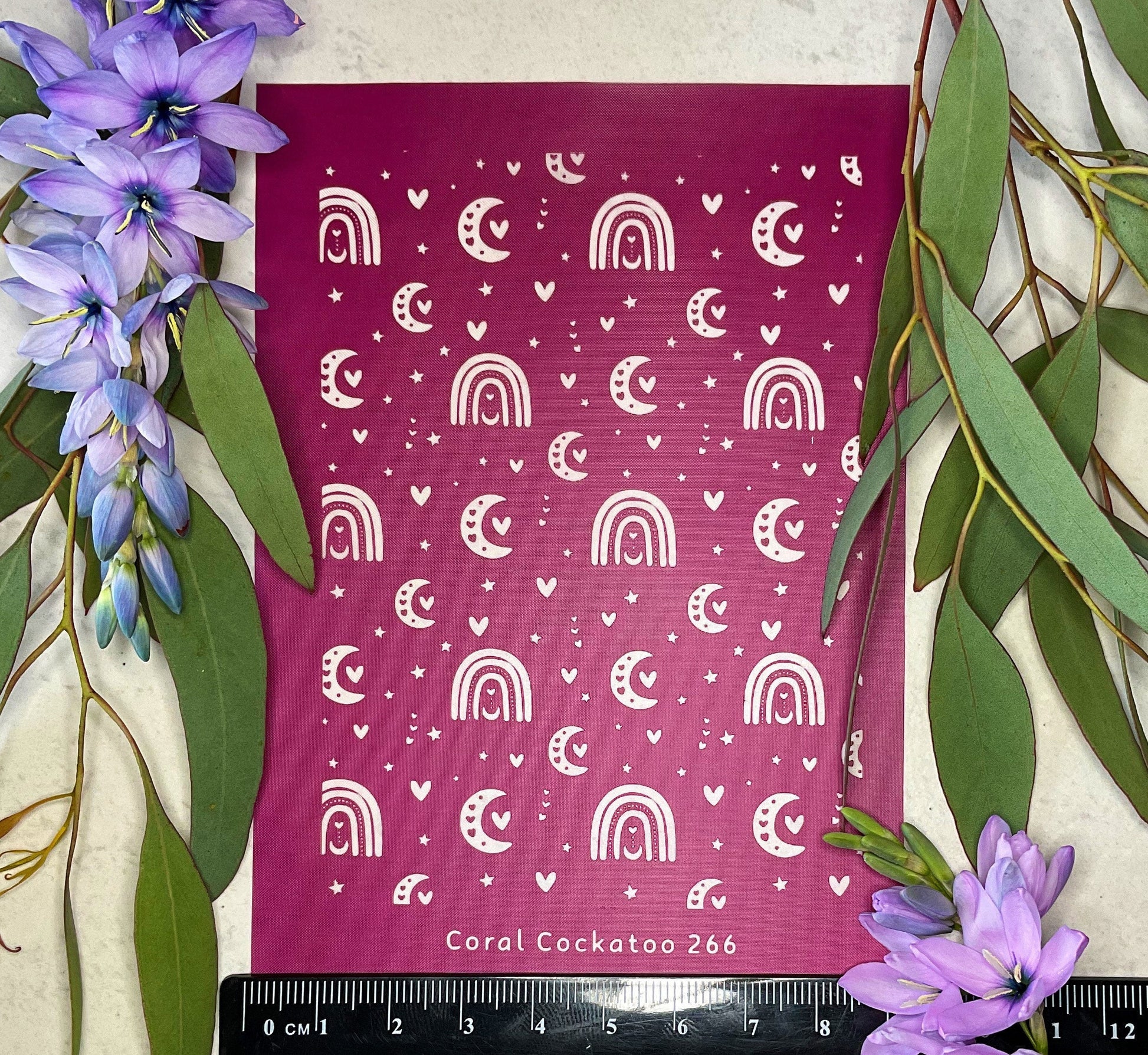 How to use your new Coral Cockatoo Silkscreen: Place the silk screen on top of your polymer clay or other decorative surface, make sure you can read the Coral Cockatoo Logo, it is facing the right way up. Apply your colour in the form of a good quality Artists Acrylic paint, gently swipe the paint across the silkscreen with a squeegee, scraper or old card, hold the squeegee at a 45 degree angle and pull towards you gently, pulling the paint across the silk screen. Once adequately spread through the design, lift up the silk screen by gently starting with the bottom right hand corner.