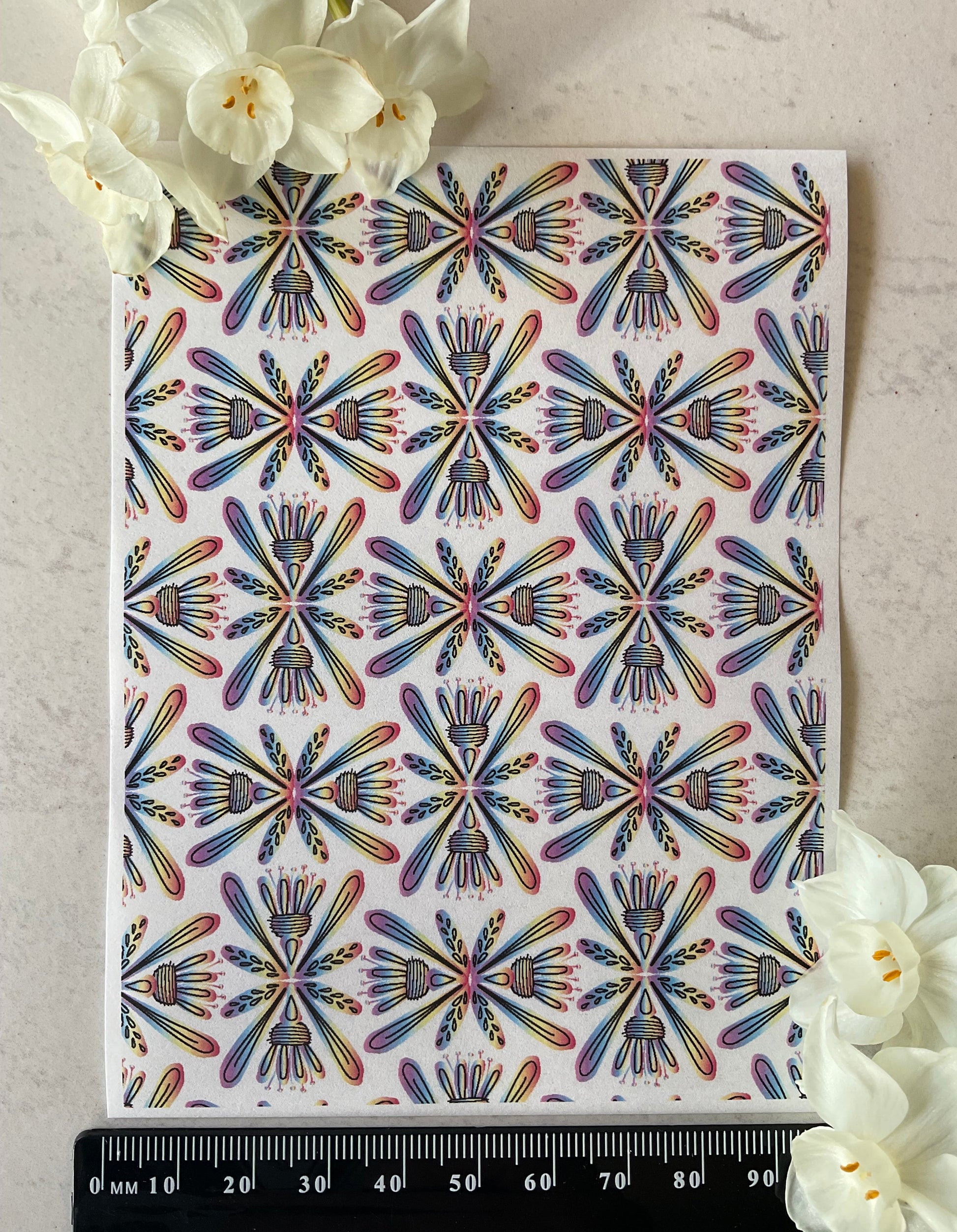 How to use your new Coloured Water Soluble Transfer: Condition your Polymer Clay well and roll onto a ceramic tile. We find white or light coloured clay gives the best crisp image transfer. Place the transfer design sheet image side down on the clay. Smooth over gently with your fingers or a roller to remove air bubbles. Leave the transfer on your Polymer Clay for 15 minutes. Place the entire clay slab under gently flowing water and the transfer paper will start to dissolve. You can gently use your fingers to remove the excess transfer paper but don’t worry, excess transfer fluff can be removed after baking. Gently pat with paper towel or leave to air dry. When dry cut your clay with your favourite cutters and bake as per Polymer Clay instructions. You may find colours vary slightly after baking depending on clay used and your baking process, we recommend tenting your pieces while baking to protect them.