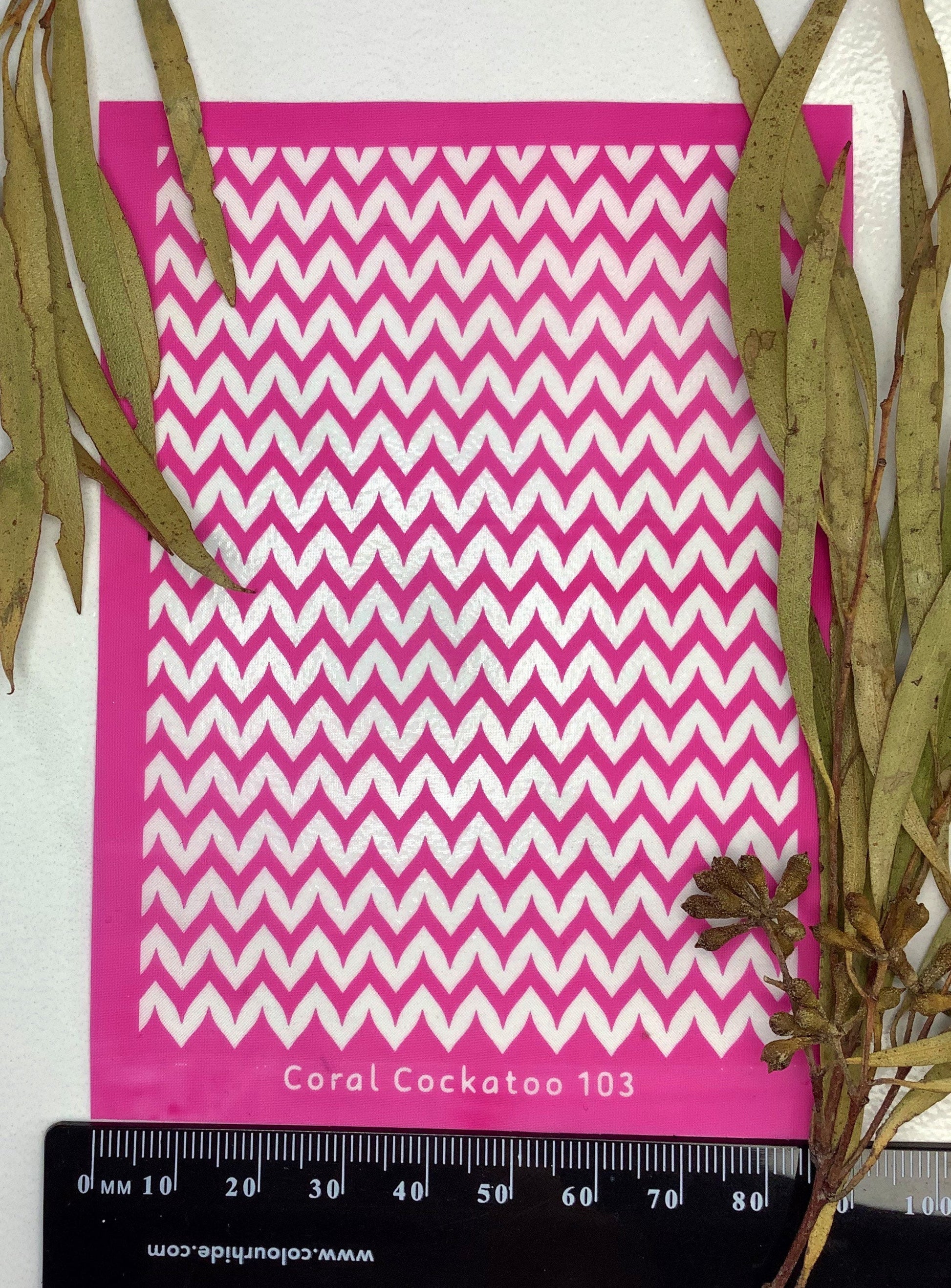 How to use your new Coral Cockatoo Silkscreen: Place the silk screen on top of your polymer clay or other decorative surface, make sure you can read the Coral Cockatoo Logo, it is facing the right way up. Apply your colour in the form of a good quality Artists Acrylic paint, gently swipe the paint across the silkscreen with a squeegee, scraper or old card, hold the squeegee at a 45 degree angle and pull towards you gently, pulling the paint across the silk screen. Once adequately spread through the design, lift up the silk screen by gently starting with the bottom right hand corner.