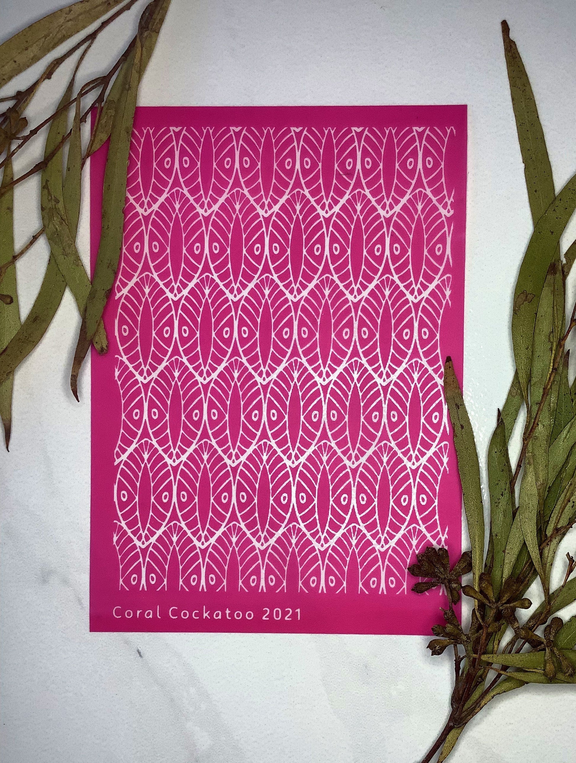 Important Info: Use your unique Coral Cockatoo Silkscreen for anything from earring and jewellery pieces to paper craft and card creations and more! The possibilities are limited only by your imagination and creativity!